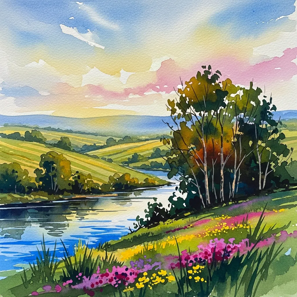 A peaceful mountain vista captured with delicate wet-on-wet techniques, demonstrating mastery of atmospheric perspective and color harmony.