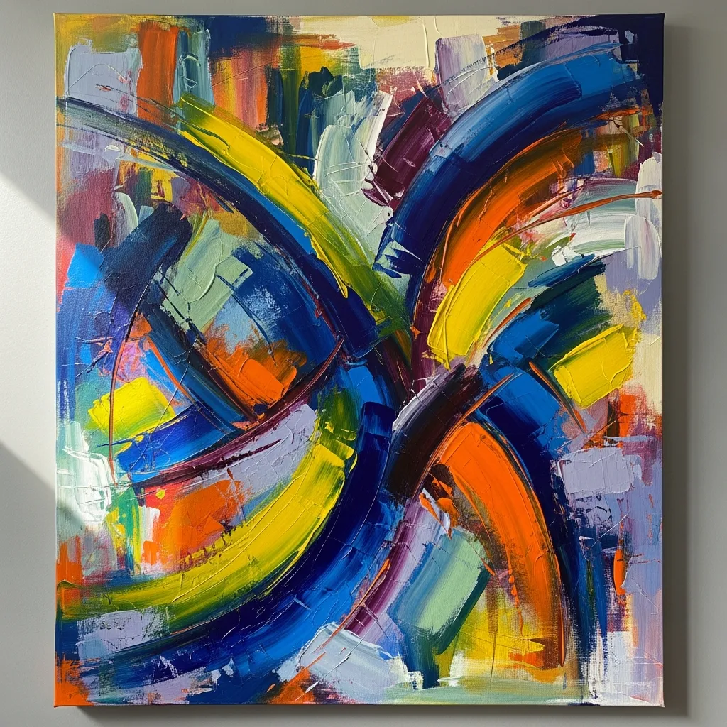 Bold color choices and dynamic composition create vibrant movement, exemplifying confident contemporary acrylic techniques.